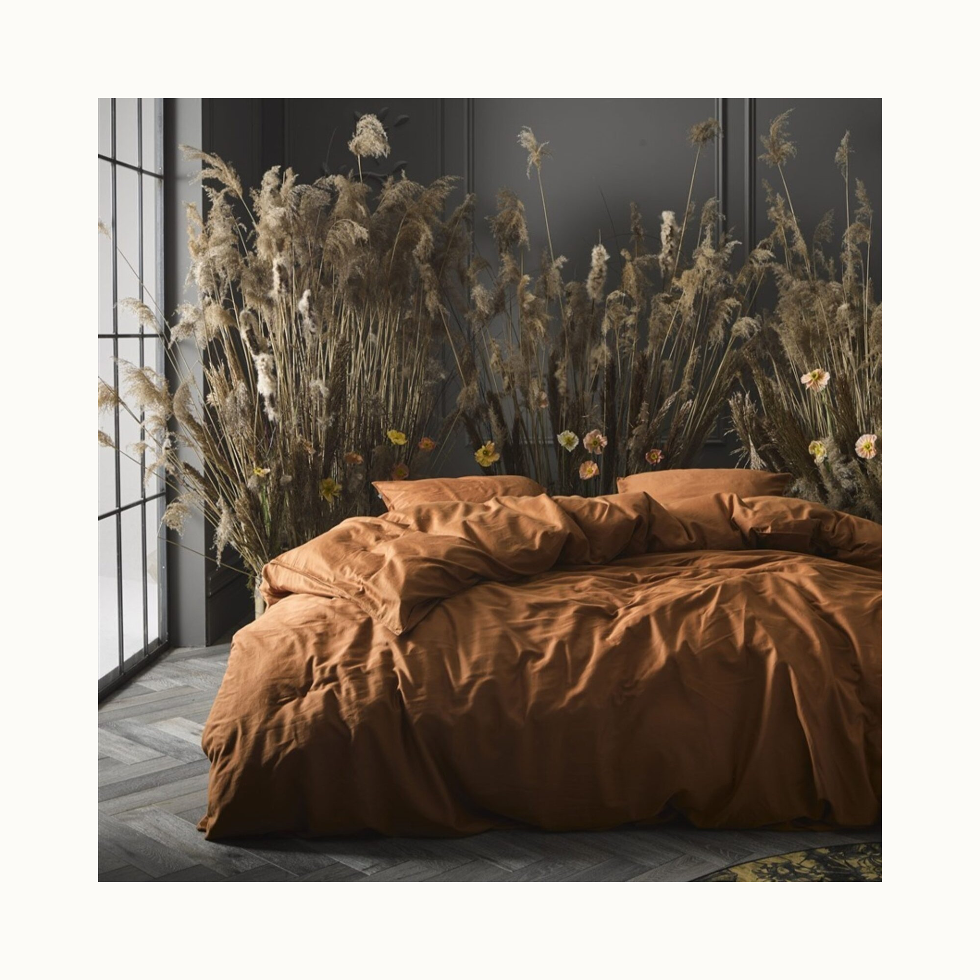 This leather brown duvet cover brings tranquility and atmosphere to the bedroom. Beautiful colors combined with high-quality fabric will truly amaze you. Thanks to the fine yarns, satin weave, high 300 thread count, and special enzyme wash, the cover gains an elegant sheen and feels exceptionally smooth. A uniquely velvety-soft duvet cover that is long-lasting and timeless.