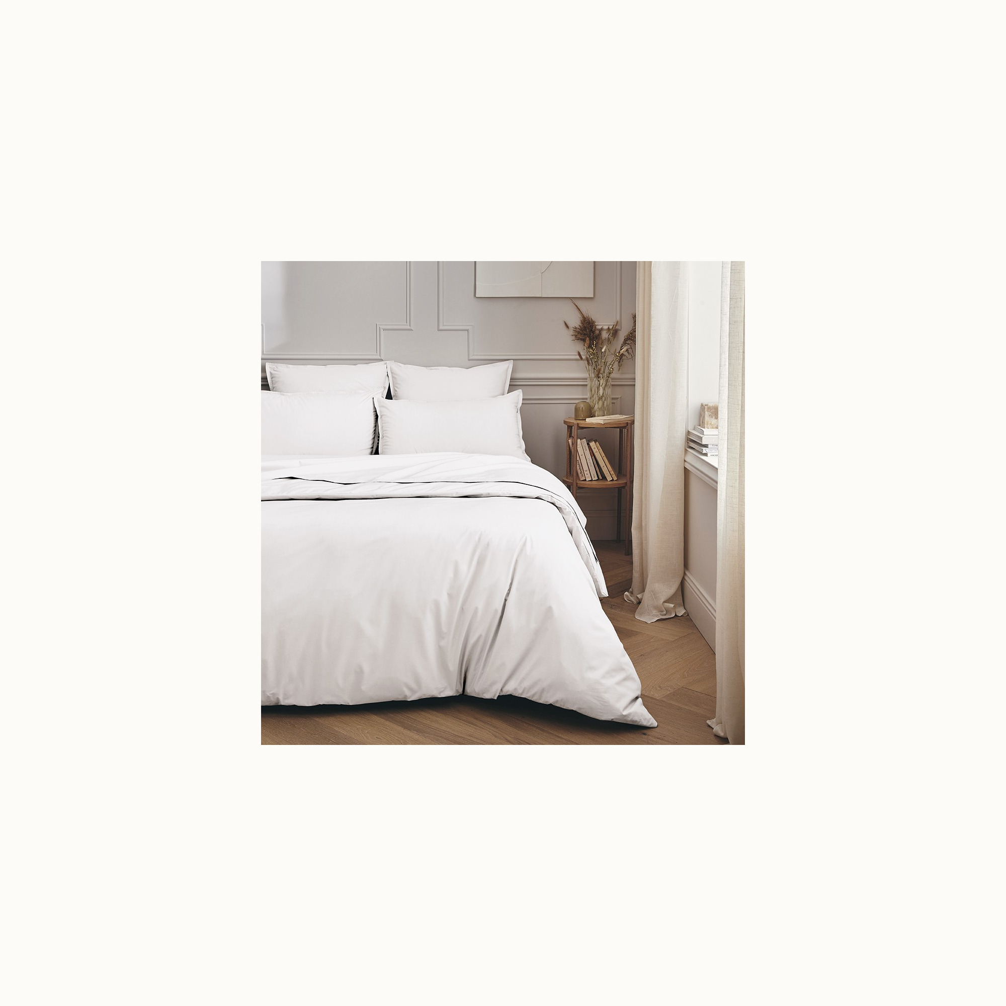 This white percale sheet is woven from 100% combed long-fibre cotton. The fresh, matte and breathable fabric feels soft yet durable, while the subtle flange with double stitching gives the pillowcases an elegant finish. Made in France, with attention to detail and comfort.