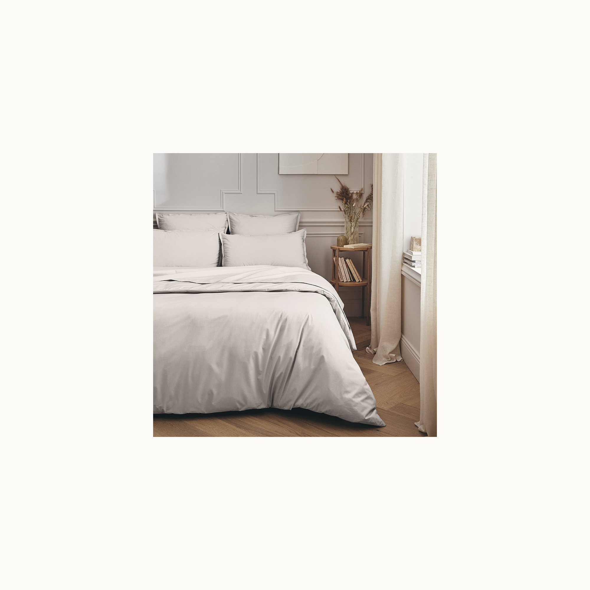This light grey percale sheet is woven from 100% combed long-fibre cotton. The fresh, matte and breathable fabric feels soft yet durable, while the subtle flange with double stitching gives the pillowcases an elegant finish. Made in France, with attention to detail and comfort.