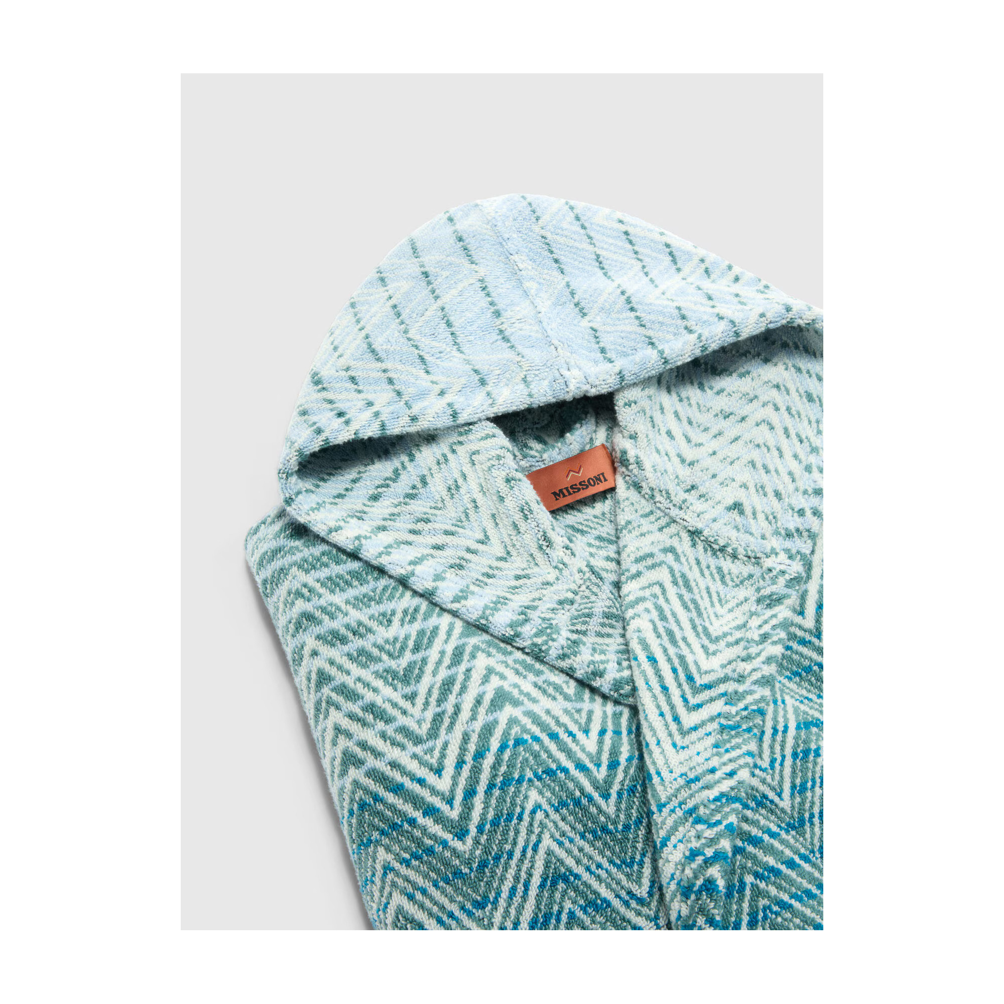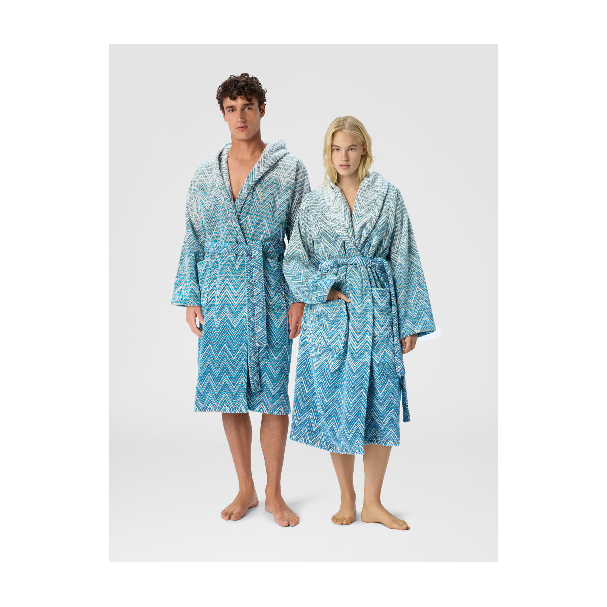 Ervaar de luxe & comfort van uw badjas. Dit iconische zigzagmotief in petrol kleur heeft een uniek en tijdloos karakter. Zijn harmonieuze kleurschakering & ultra zachte kwaliteit is een must have in huis.