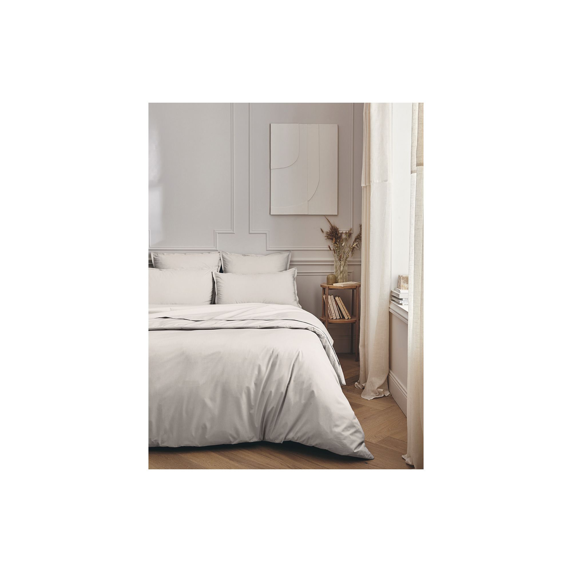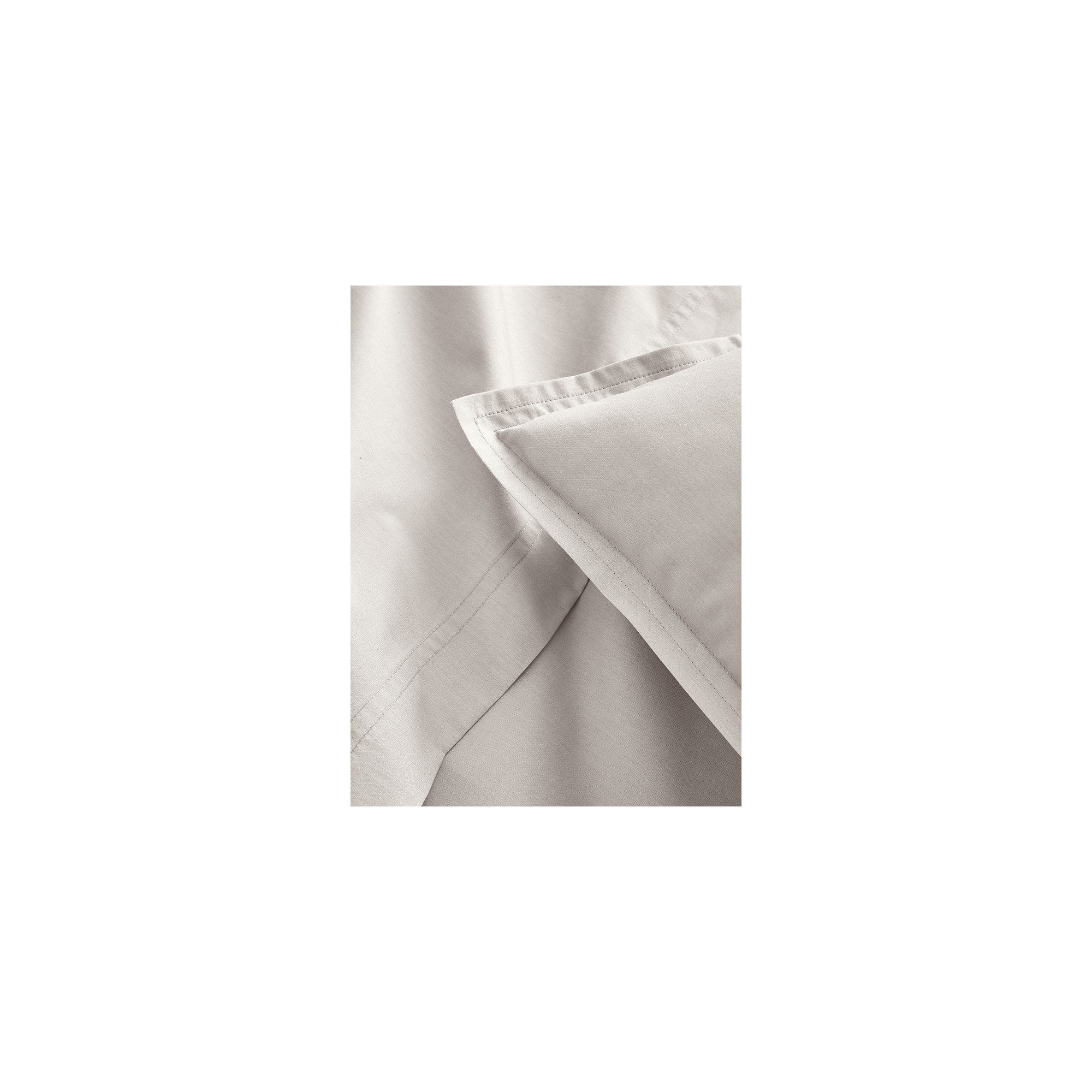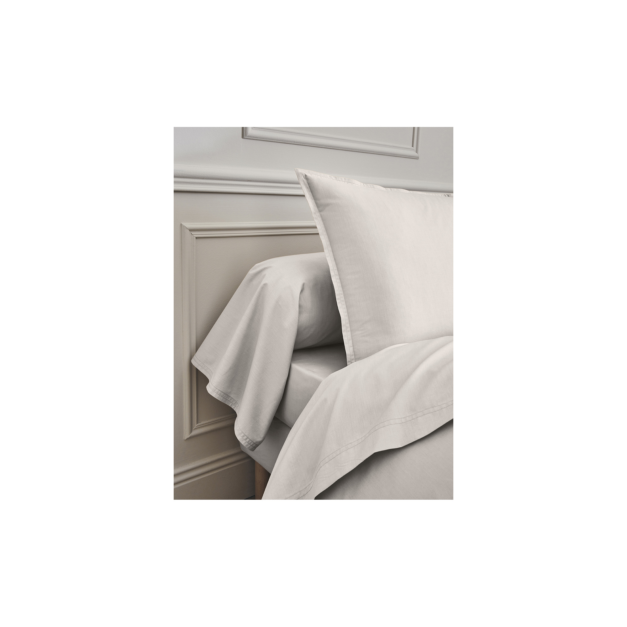 Dit licht grijs percale sloop is geweven uit 100% gekamd katoen met lange vezels. Het frisse, matte en ademende materiaal voelt zacht en duurzaam aan, terwijl de subtiele volant met dubbele stiksels de kussenslopen een elegante afwerking geeft. Gemaakt in Frankrijk, met oog voor detail en comfort.