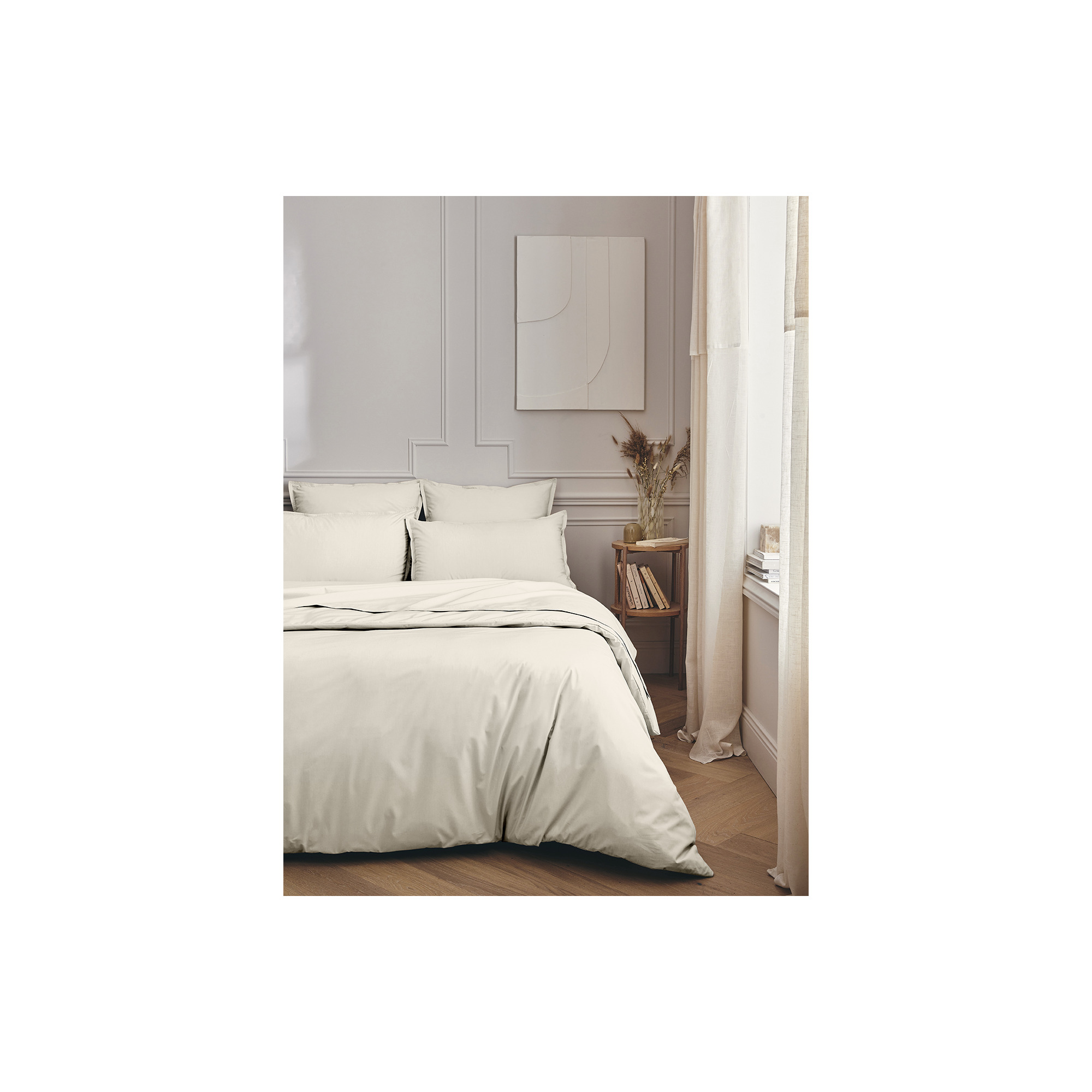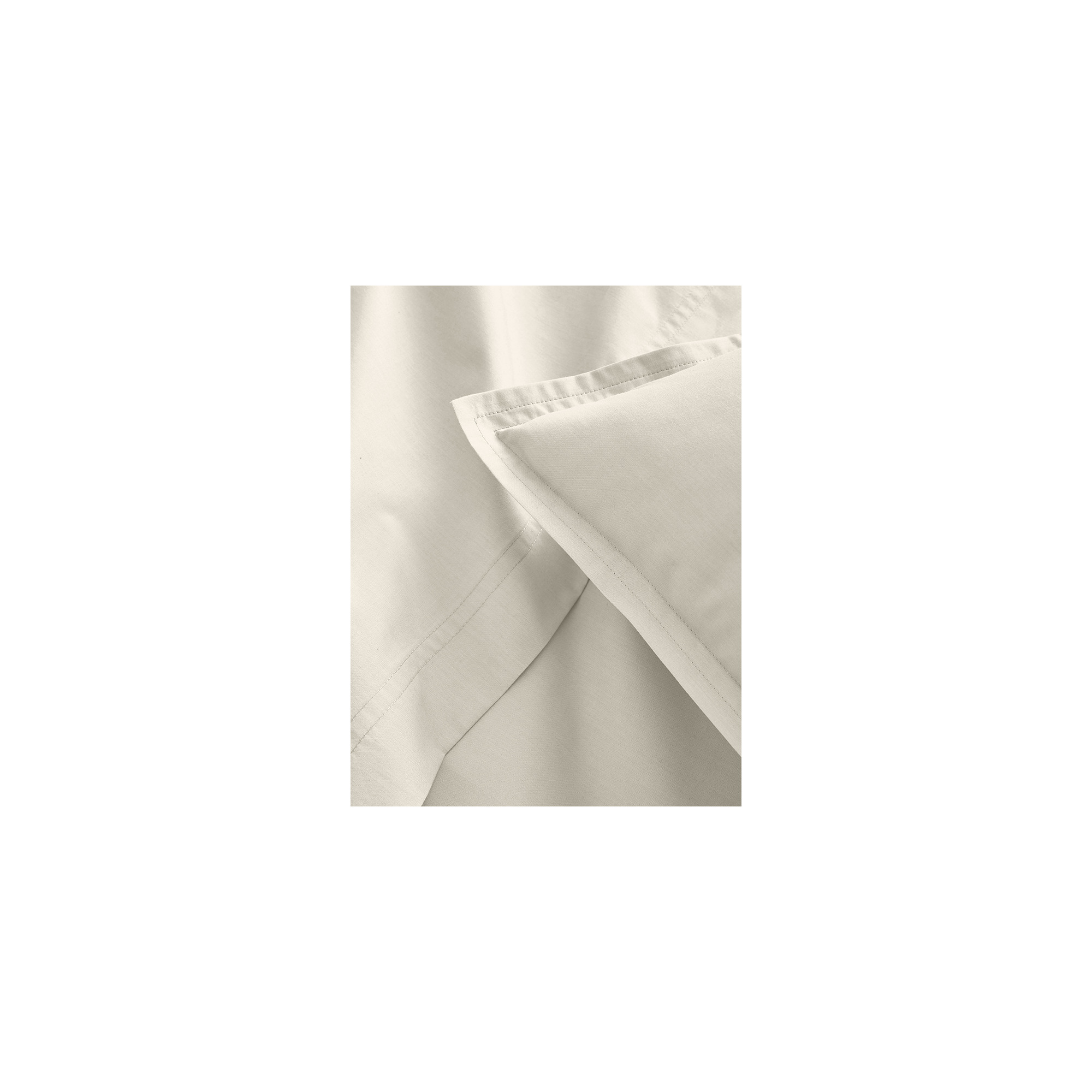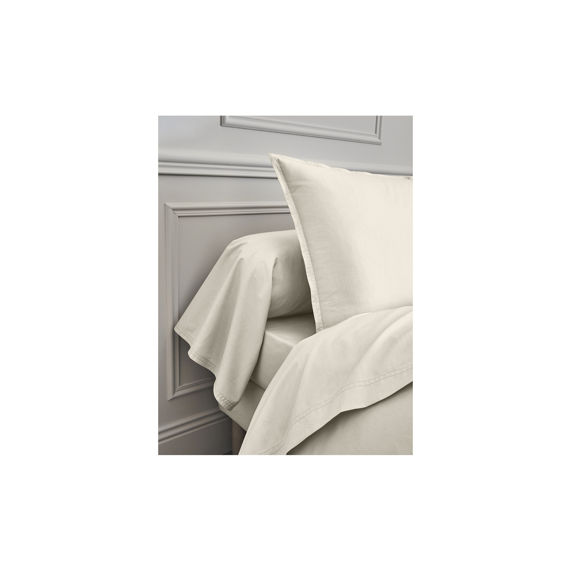 Dit percale licht neutrale laken is geweven uit 100% gekamd katoen met lange vezels. Het frisse, matte en ademende materiaal voelt zacht en duurzaam aan, terwijl de subtiele volant met dubbele stiksels de kussenslopen een elegante afwerking geeft. Gemaakt in Frankrijk, met oog voor detail en comfort.