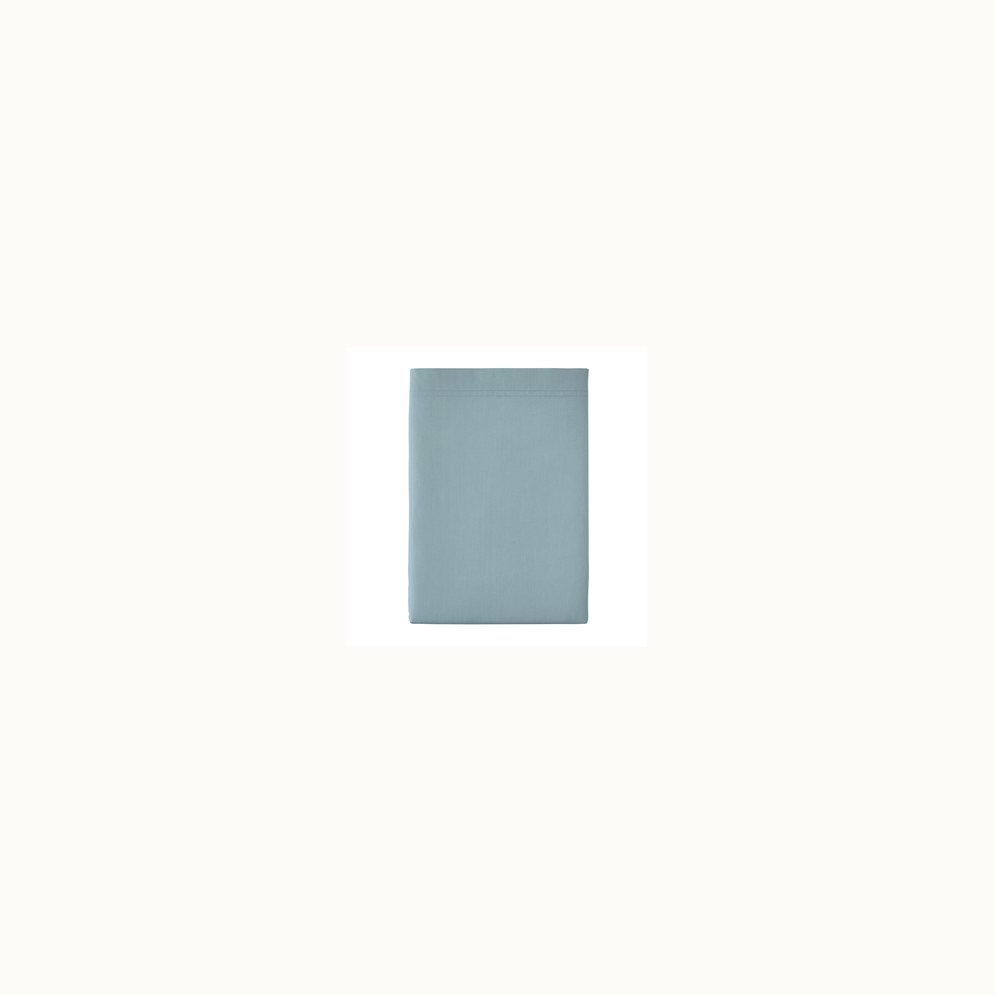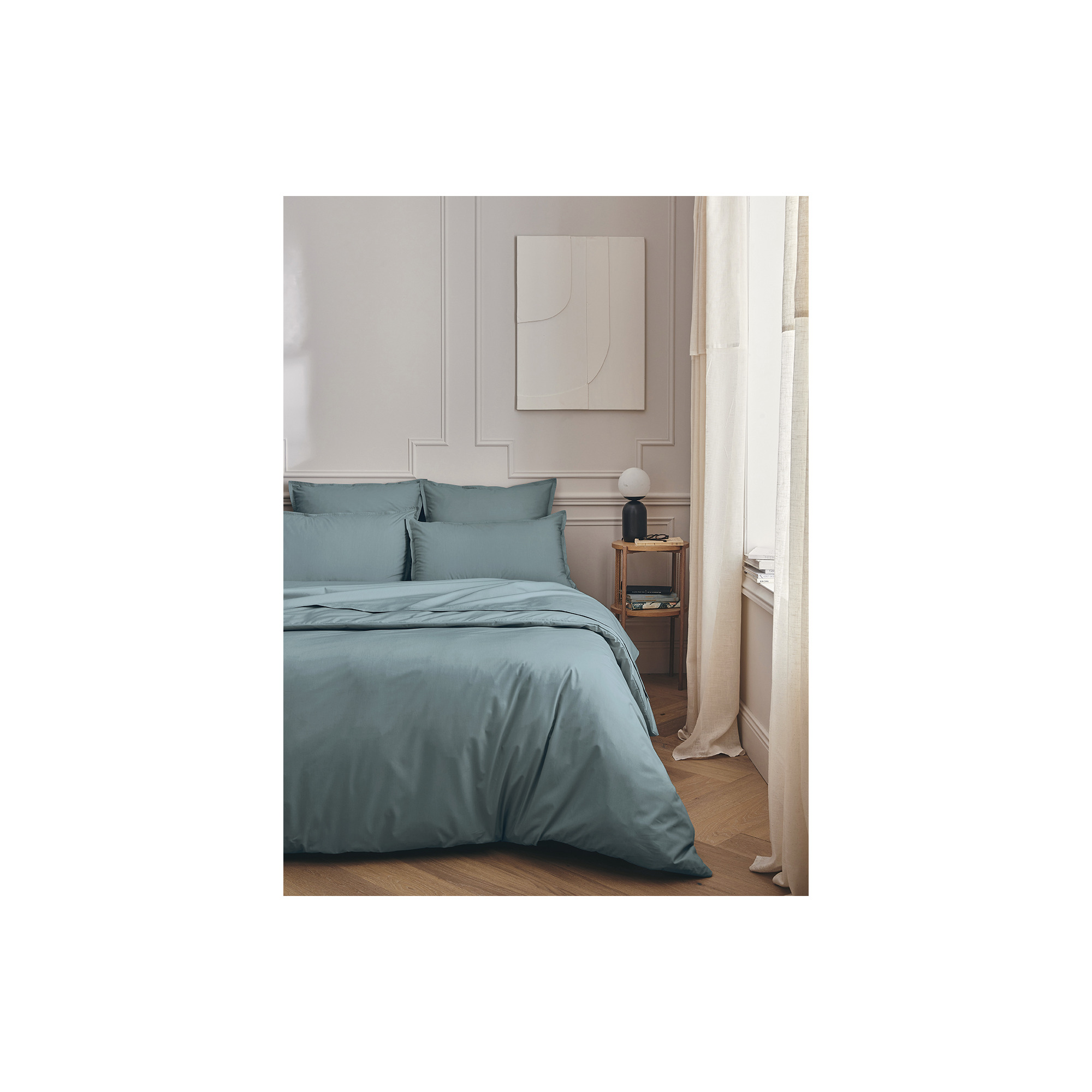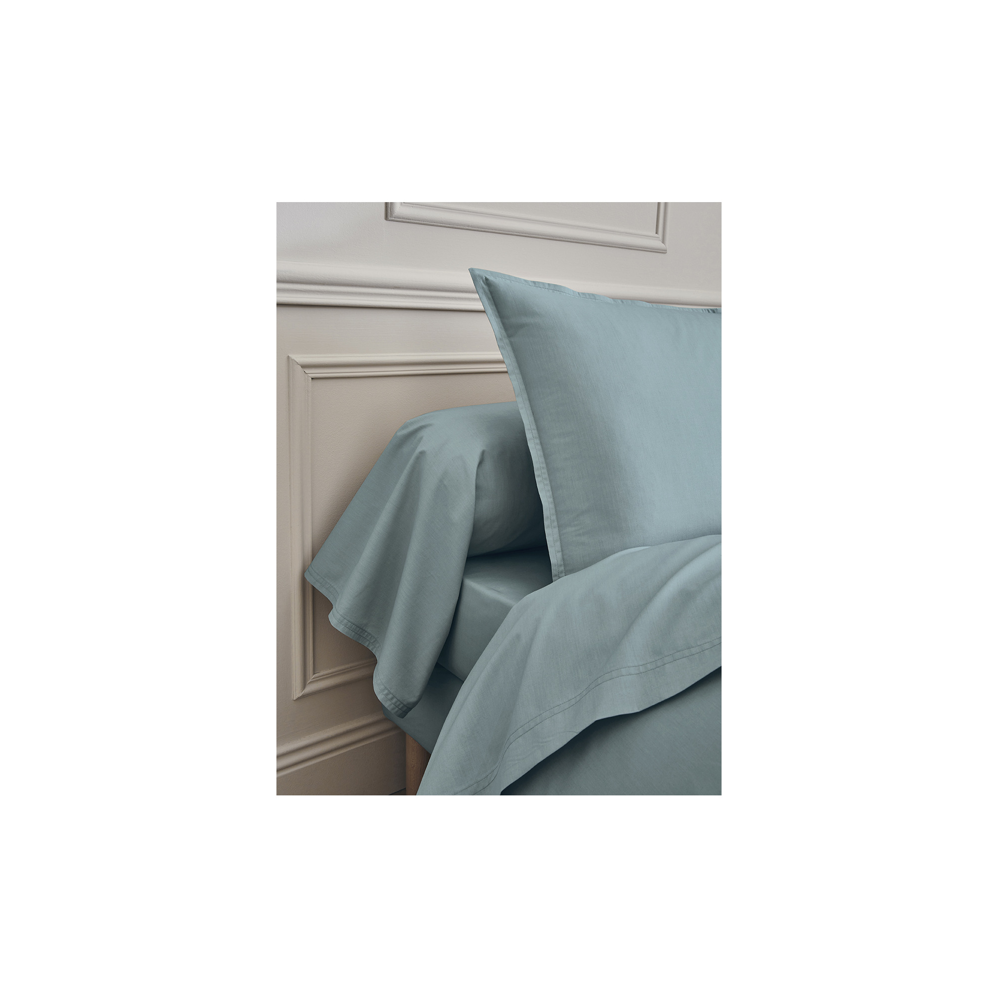 Dit percale laken met een serene tint tussen blauw en groen is geweven uit 100% gekamd katoen met lange vezels. Het frisse, matte en ademende materiaal voelt zacht en duurzaam aan, terwijl de subtiele volant met dubbele stiksels de kussenslopen een elegante afwerking geeft. Gemaakt in Frankrijk, met oog voor detail en comfort.
