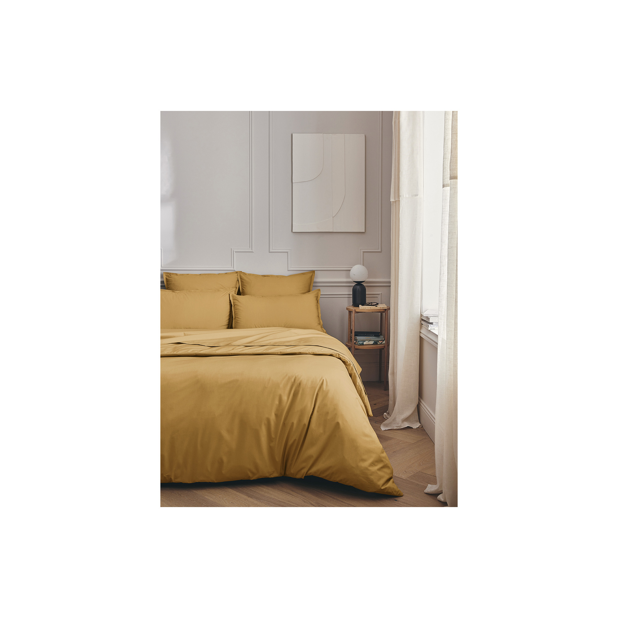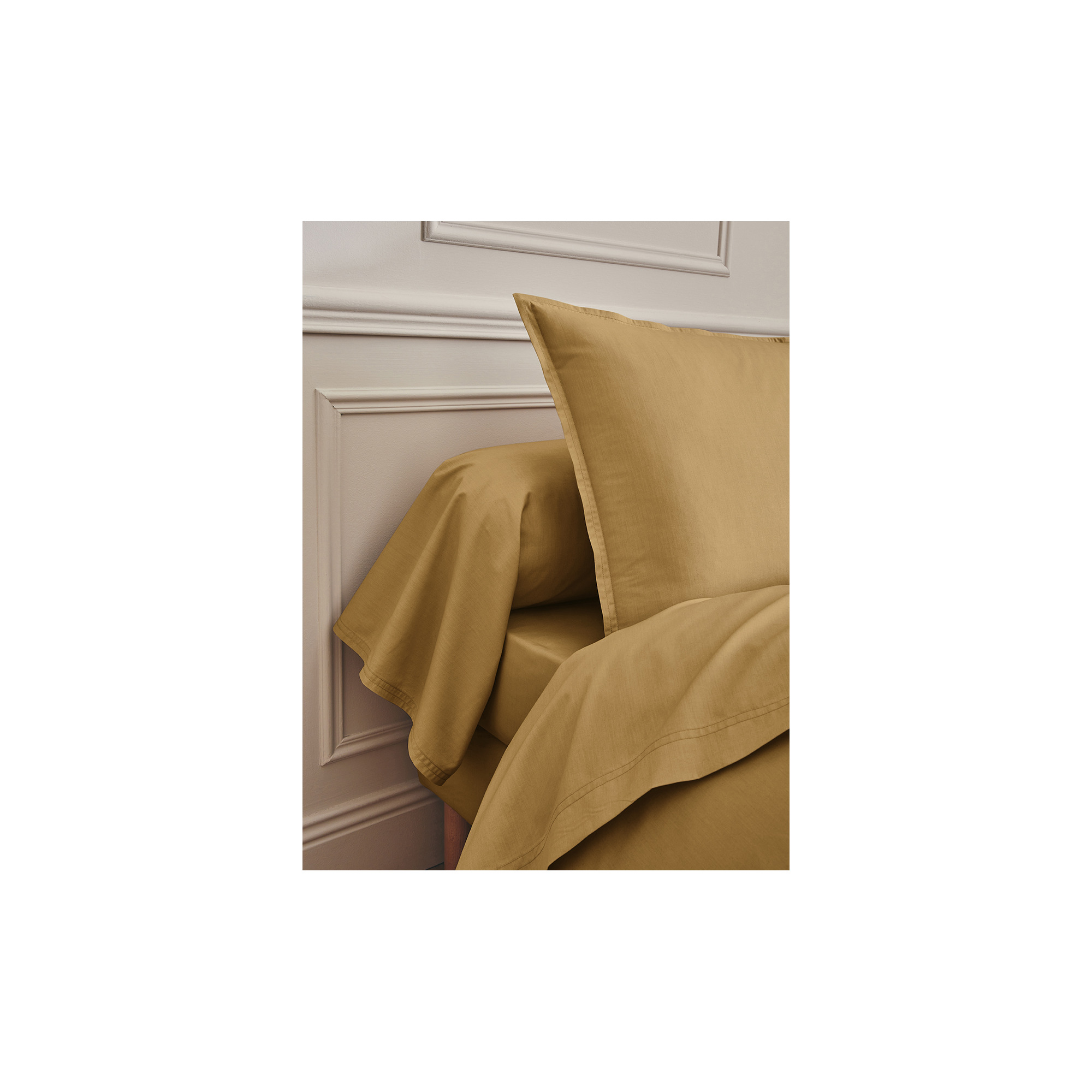 Dit percale Bruin gelig laken geweven uit 100% gekamd katoen met lange vezels. Het frisse, matte en ademende materiaal voelt zacht en duurzaam aan, terwijl de subtiele volant met dubbele stiksels de kussenslopen een elegante afwerking geeft. Gemaakt in Frankrijk, met oog voor detail en comfort.