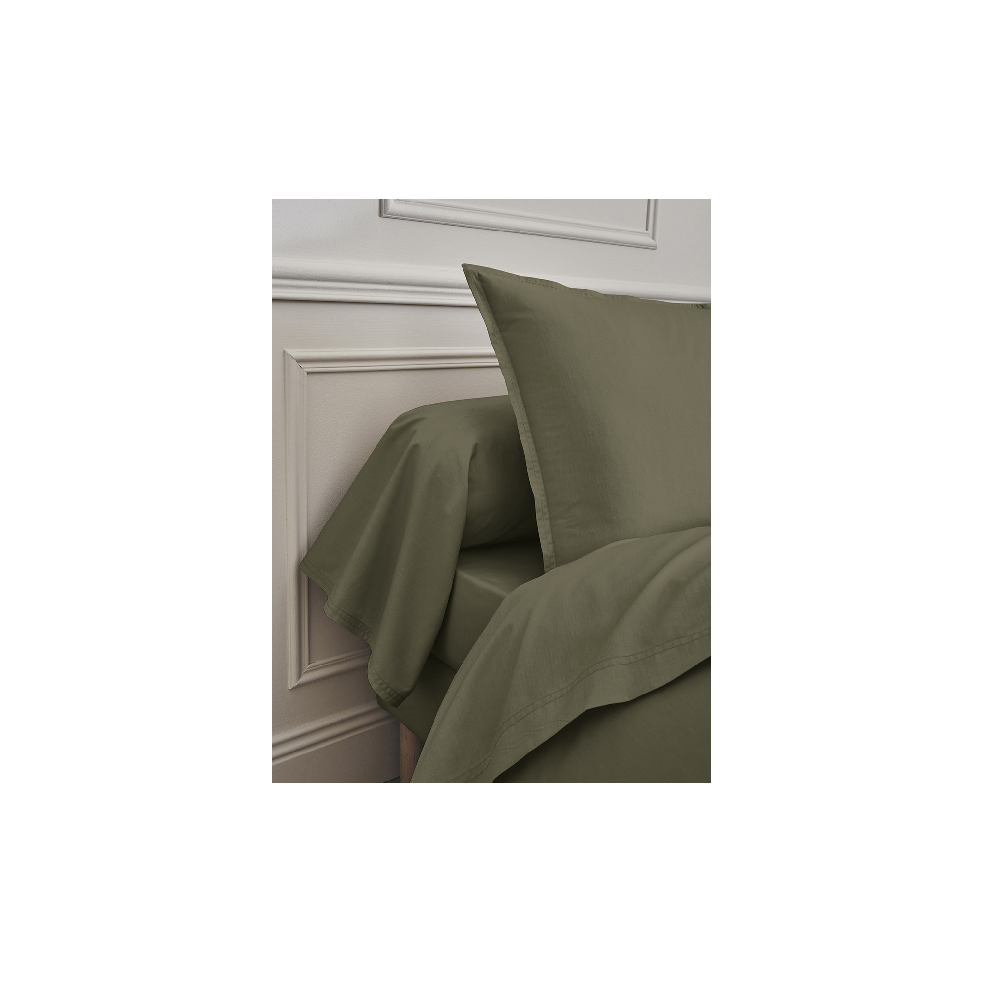 Dit percale khaki groen hoeslaken geweven uit 100% gekamd katoen met lange vezels. Het frisse, matte en ademende materiaal voelt zacht en duurzaam aan. Gemaakt in Frankrijk, met oog voor detail en comfort.